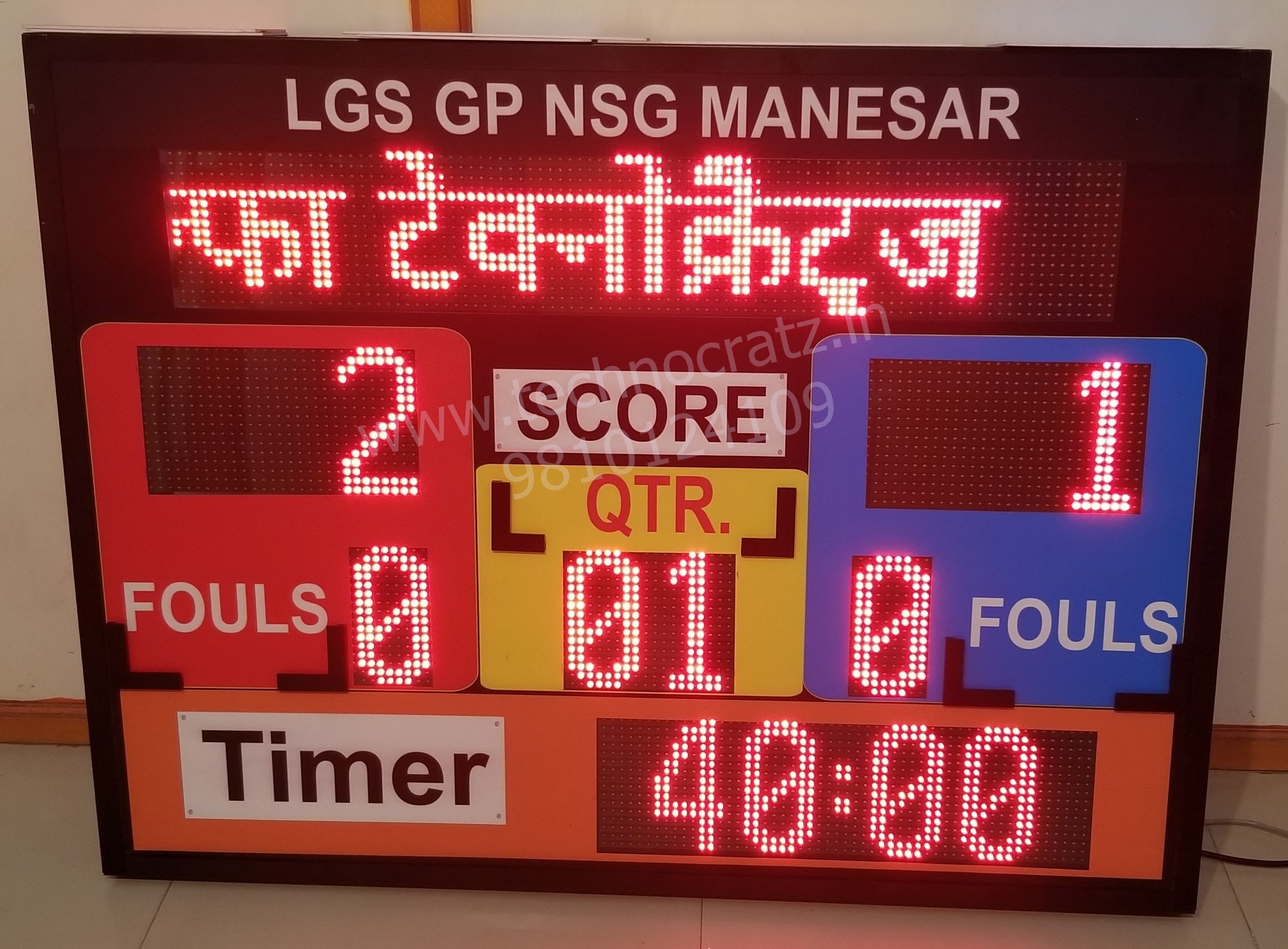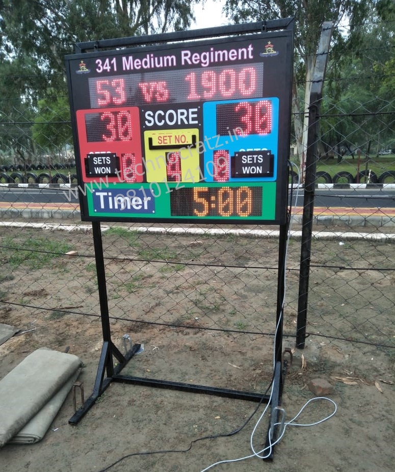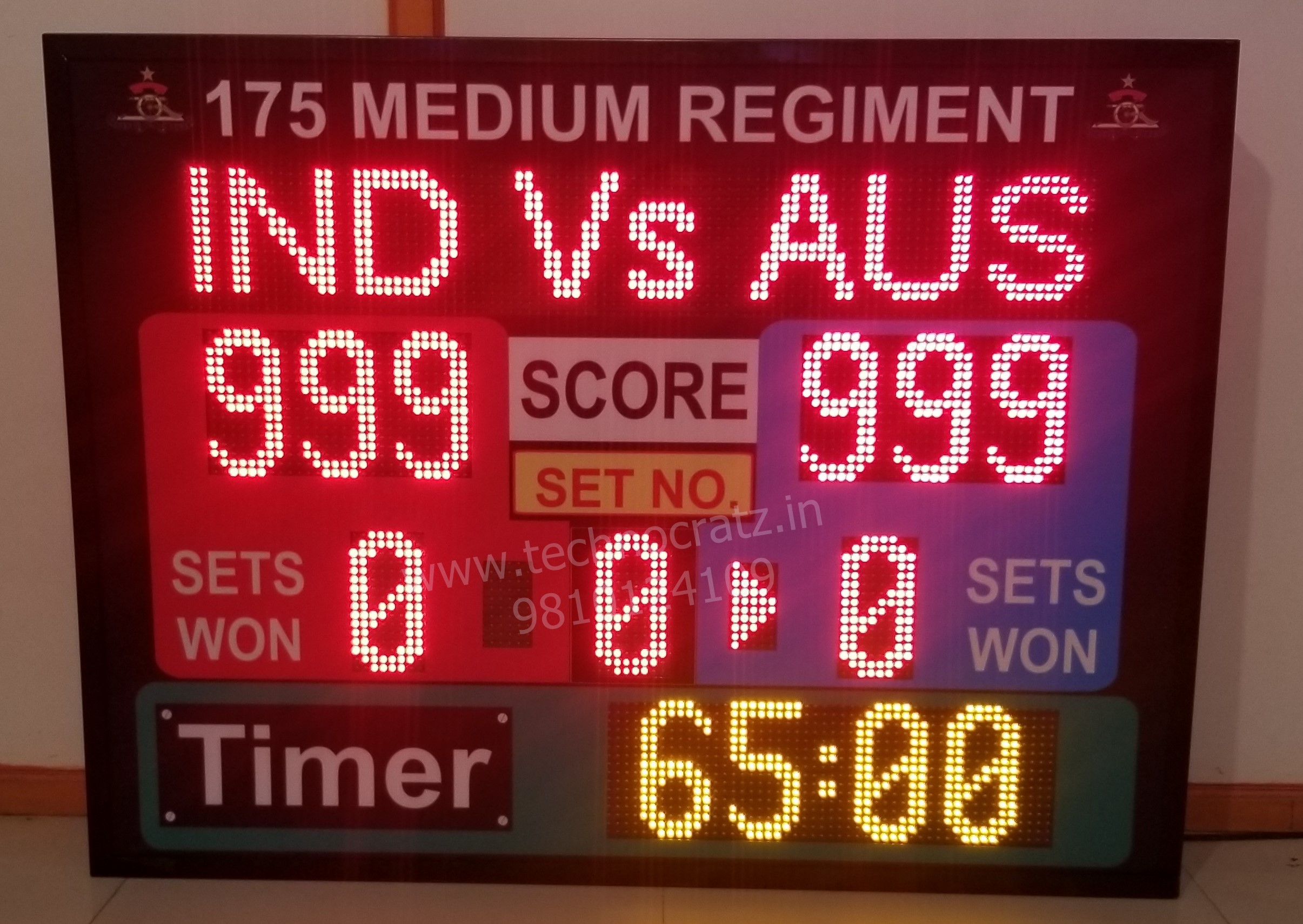 3 digit Scores of two Teams, Set No. and Sets Won, Game Timer and Running line for team names with variable font and language operated by separate android app.