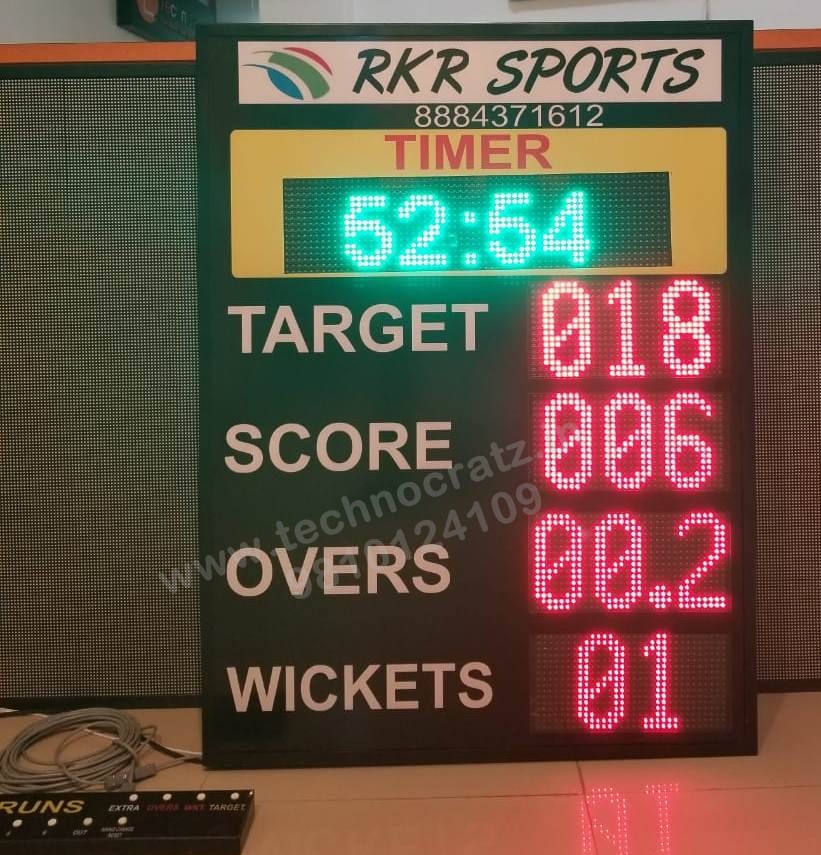 Runs, Overs, Wickets & Target. Timer at bottom which can also be used as running message line which can be programmed using a separate Android App Wi-Fi from 8 mtr